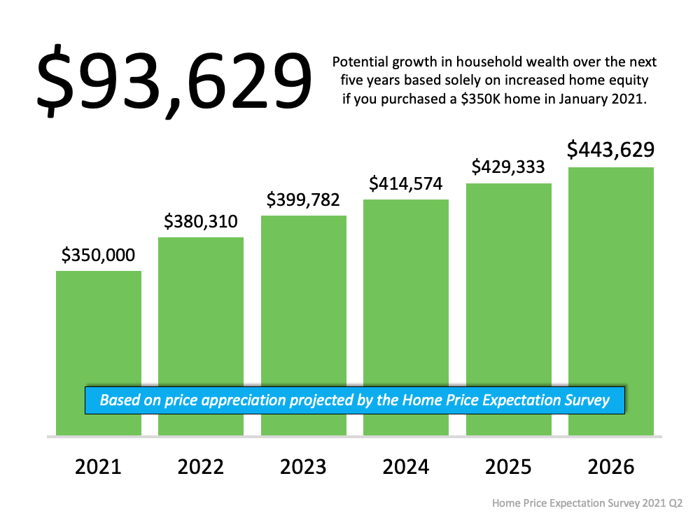 Home prices are climbing today, and the data in the survey indicates they’ll continue to increase, but at rates that approach a more normal pace. Even still, the amount of household wealth a homeowner stands to earn going forward is substantial. This truly becomes clear when we consider a scenario using a median-priced home purchased in January of 2021 and the projected rate of appreciation on that home over the next five years. As the graph below illustrates, a homeowner could increase their net worth by a significant amount – over $93,000 dollars by 2026.
