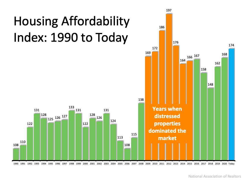 So, the higher the index, the more affordable it is to purchase a home. Here’s a graph of the index going back to 1990:Buying a Home Is Still Affordable | Simplifying The MarketThe blue bar represents today’s affordability. We can see that homes are more affordable now than they’ve been at any point since the housing crash when distressed properties (foreclosures and short sales) dominated the market. Those properties were sold at large discounts not seen before in the housing market for almost one hundred years.
