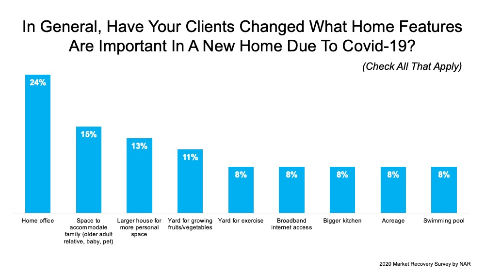 The latest Market Recovery Survey from NAR shares some of the features and amenities buyers are looking for, especially since the health crisis has shifted many buyer priorities. The most common home features cited as increasingly important are home offices and space to accommodate family members new to the residence (See graph below):Does Your Home Have What Buyers Are Looking For? | Simplifying The MarketThe survey results also show that among buyers who indicate they would now like to live in a different area due to COVID-19, 47% have an interest in purchasing in the suburbs, 39% cite rural areas, and 25% indicate a desire to be in small towns.