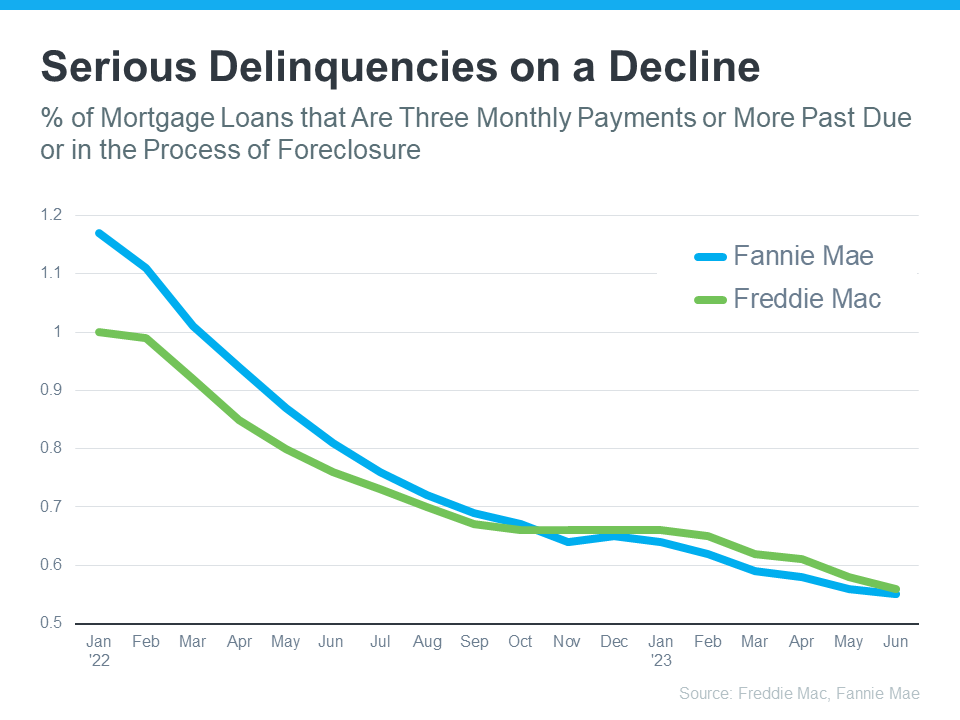 But now, lending standards have tightened, leading to more qualified buyers who can afford to make their mortgage payments. And data from Freddie Mac and Fannie Mae shows the number of homeowners who are seriously behind on their mortgage payments is declining (see graph below):