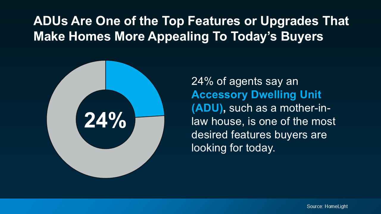 ADUs are growing in popularity as more people discover why they’re so practical. In fact, a recent survey shows that 24% of agents say an ADU, such as a mother-in-law house, is one of the most desired features buyers are looking for right now.
