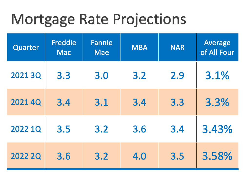 Another significant factor that should inform your decision is mortgage interest rates. Today’s average rates remain close to record-lows. Much like prices, though, experts forecast rates will rise over the coming months, as the chart below shows: