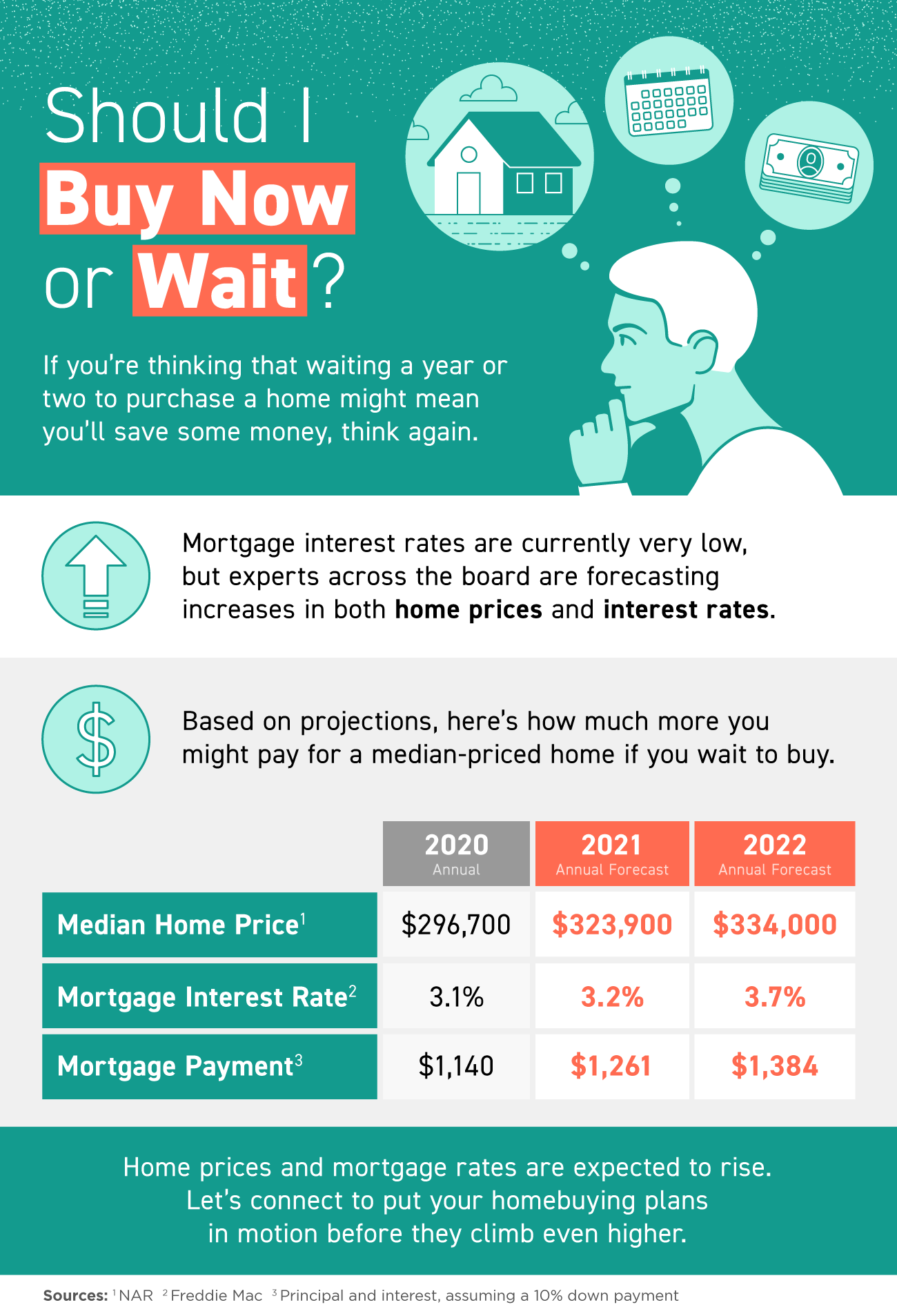 • Buying a home now means you’ll spend less in the long run. Let’s connect to put your homebuying plans in motion before home prices and mortgage rates climb even higher.