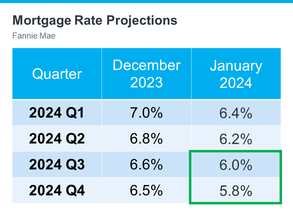 The chart shows mortgage rate projections for 2024 from Fannie Mae. It includes the one that came out in December, and compares it to the updated 2024 forecast they released just one month later. And if you look closely, you’ll notice the projections are on the way down.