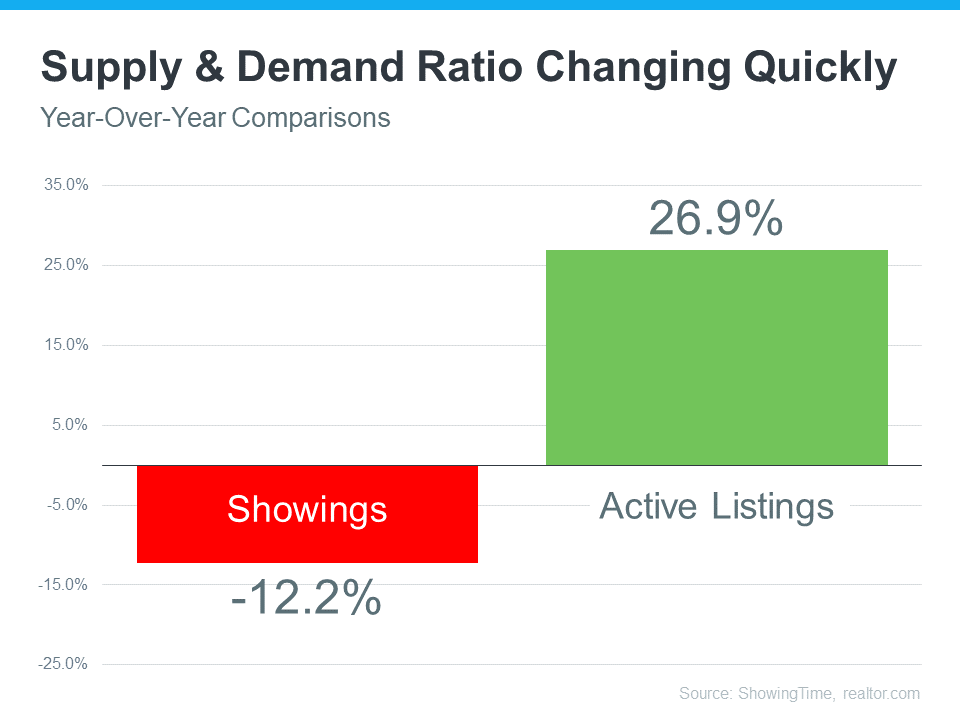 This year, buyer demand has eased as higher mortgage rates and mounting economic uncertainty moderated the market. This slowdown in demand is clear when you look at the red bar on the graph. It uses the latest data from ShowingTime to illustrate how showings (an indicator of buyer demand) have softened by just over 12% compared to the same time last year.