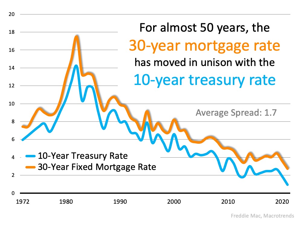 Many things impact mortgage rates. The economy, inflation, and Fed policy, just to name a few. That makes forecasting rates difficult. However, there’s one metric that has held up over the last fifty years – the relationship between mortgage rates and the 10-year treasury rate. Here’s a graph detailing this relationship since Freddie Mac started keeping mortgage rate records in 1972: