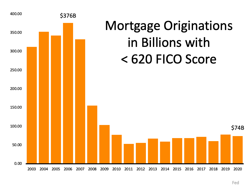 The graph below shows the billions of dollars in mortgage money given annually to borrowers with a credit score under 620.There’s No Reason To Panic Over Today's Lending Standards | Simplifying The MarketIn 2006, mortgage entities originated $376 billion dollars in loans for purchasers with a score under 620. Last year, that number was only $74 billion.