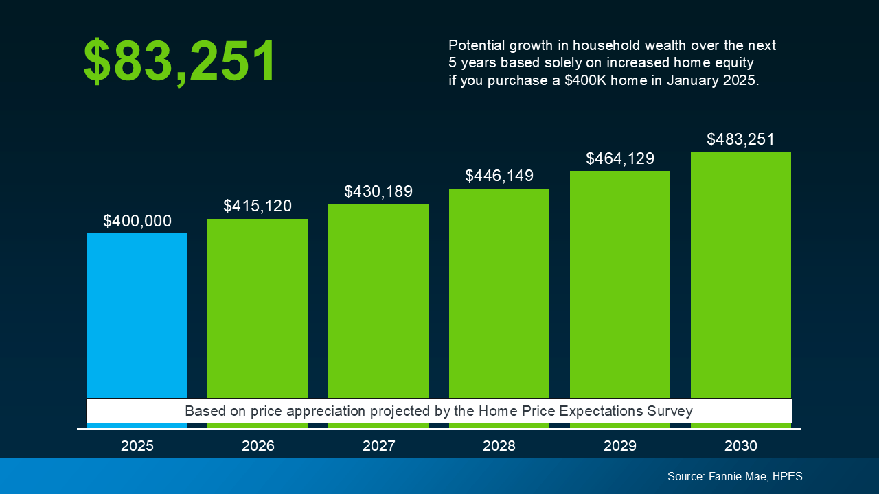 a graph of growth of a houseIn this example, let’s say you go ahead and buy a $400,000 home this January. Based on the expert forecasts from the HPES, you could gain more than $83,000 in household wealth over the next five years. That’s not a small number. If you keep on renting, you’re losing out on this equity gain.