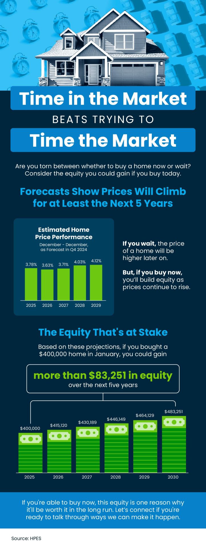- Forecasts show prices will climb for at least the next 5 years. If you wait, the price of a home will be higher later on. But, if you buy a $400K now, you could gain roughly $83K in equity as prices rise.