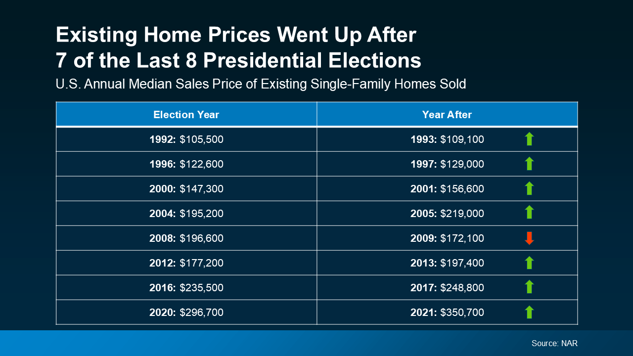 While it’s natural to feel a bit uncertain during an election year, history shows the housing market remains strong and resilient. And this means you don’t have to pause your plans in the meantime. For help navigating the market during this election cycle, reach out to a local real estate agent.