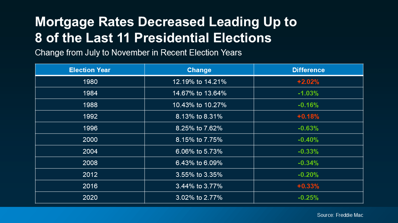 And the third thing that’s likely on your mind is mortgage rates, since they impact your monthly payment if you’re financing a home. Looking at the last 11 Presidential election years, data from Freddie Mac shows mortgage rates decreased from July to November in 8 of them (see chart below):