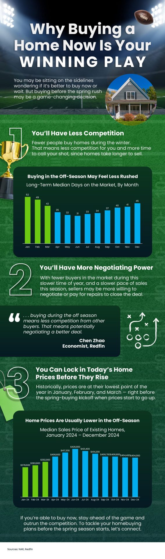 - If you’re able to buy now, stay ahead of the game and outrun the competition. To tackle your homebuying plans this year, connect with a local agent.
