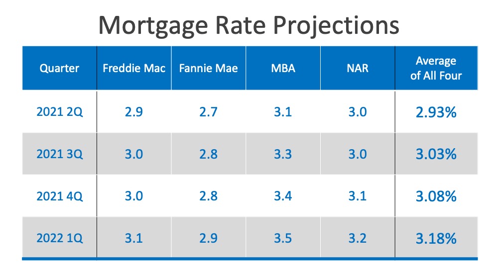 Freddie Mac isn’t the only authority forecasting low rates with a slight rise. Fannie Mae, The Mortgage Bankers Association (MBA), and the National Association of Realtors (NAR) also anticipate low rates with a small increase as 2021 continues on. Here’s the quarterly breakdown of their projections and how they’re expected to play out over the next year: